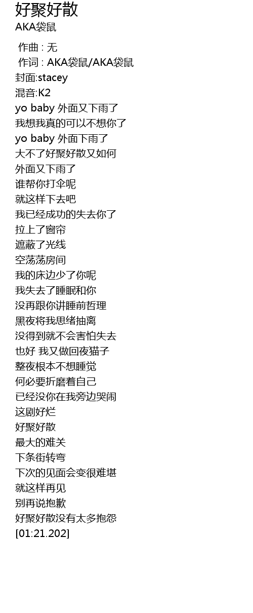 | [00:01.000] | 作词 : AKA袋鼠/AKA袋鼠 |