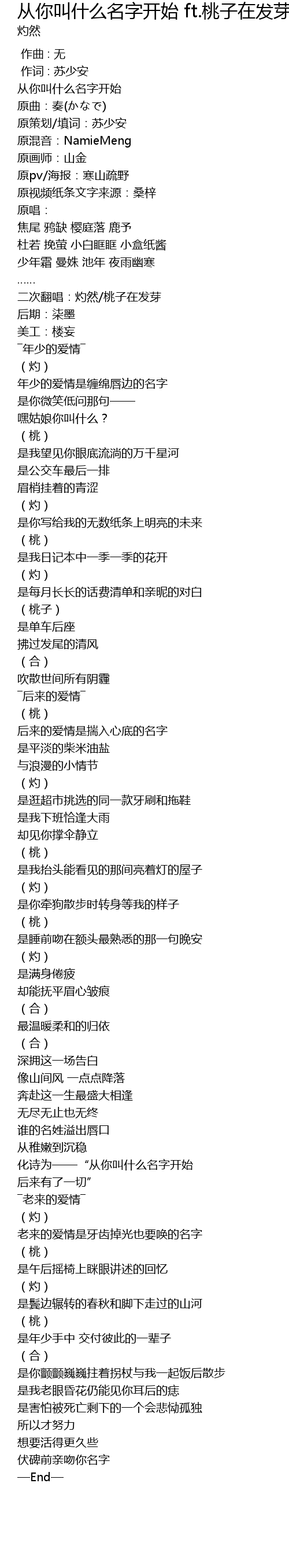 | Song | 从你叫什么名字开始 ft.桃子在发芽(Cover:雨宮天) |