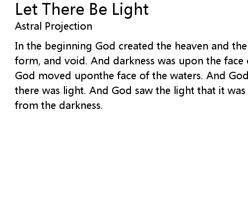 | In the beginning God created the heaven and the earth. And the earth was without form, and void. And darkness was upon the face of the deep. And the Spirit of God moved uponthe face of the waters. And God said, Let there be light. And there was light. And God saw the light that it was good and God divided light from the darkness. |