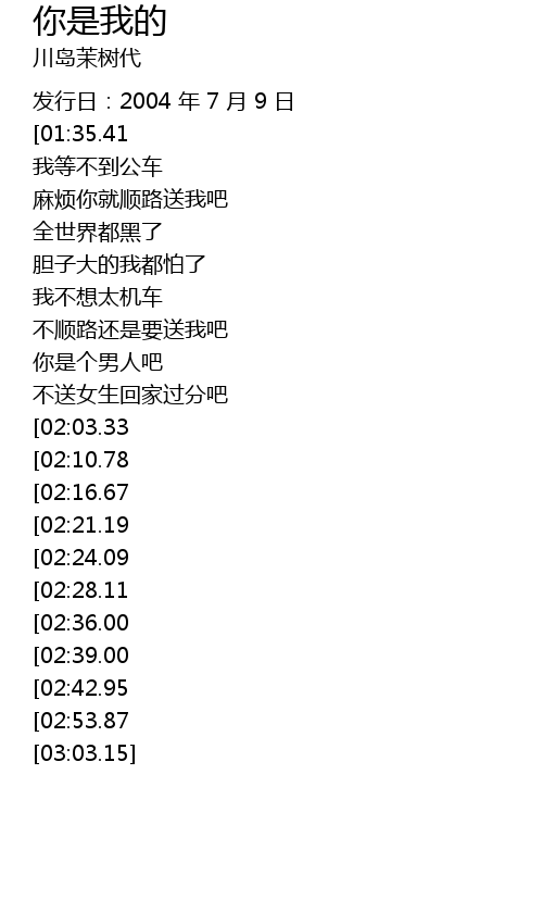 | [02:50.32][02:53.87][02:57.74] | 你是我的 |