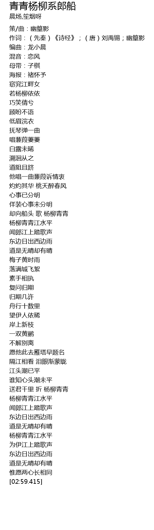 | [02:14.379] | yáng liǔ qīng qīng jiāng shuǐ píng |