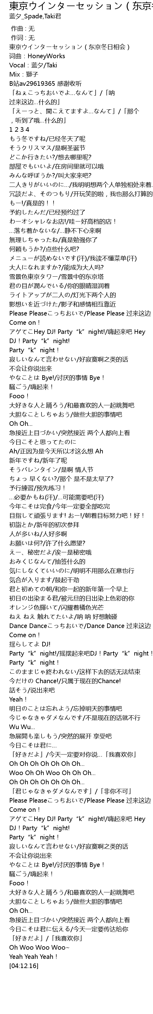 | [03:30.24] | Hey DJ! Party" k" night! hāi qǐ lái ba Hey DJ! Party" k" night! |