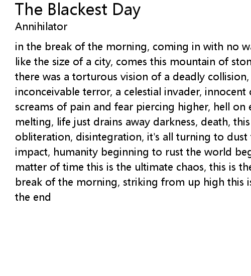 in the break of the morning, coming in with no warning, striking from up high like the size of a city, comes this mountain of stone, from a different sky there was a torturous vision of a deadly collision, we watched in agony an inconceivable terror, a celestial invader, innocent casualties burning fire, screams of pain and fear piercing higher, hell on earth is here mankind is melting, life just drains away darkness, death, this the blackest day obliteration, disintegration, it's all turning to dust from the force of the impact, humanity beginning to rust the world begins to crumble, it's all just a matter of time this is the ultimate chaos, this is the end of the line in the break of the morning, striking from up high this is the ultimate chaos, this is the end