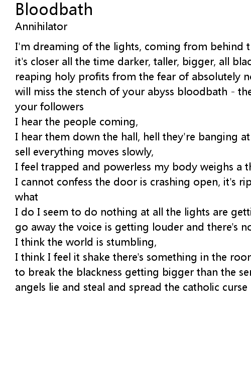 I'm dreaming of the lights, coming from behind the clouds're getting clearer, it's closer all the time darker, taller, bigger, all blackness under wing reaping holy profits from the fear of absolutely nothing bloodbath - no one here will miss the stench of your abyss bloodbath - the blood is never yours whores, your followers |