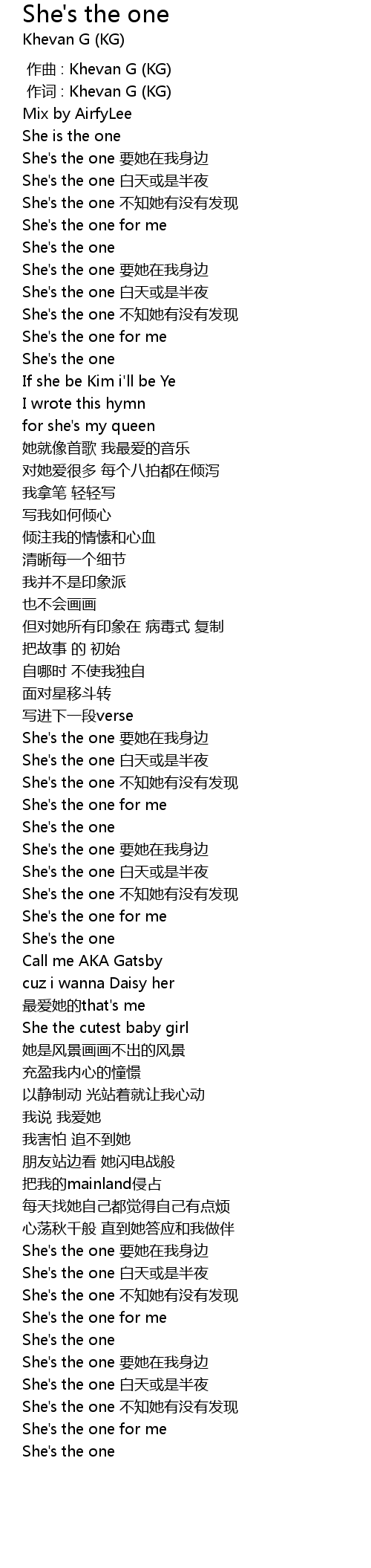 | [00:34.19] | She' s the one yào tā zài wǒ shēn biān |