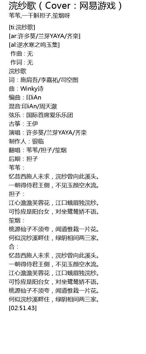 | [00:12.70] | 忆昔西施人未求,浣纱曾向此溪头。 |