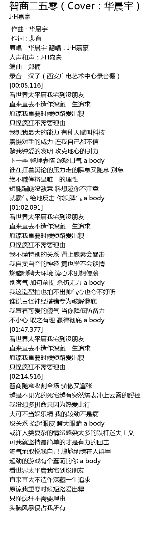| [00:01.617] | 原唱:华晨宇 翻唱:J·H嘉豪 |