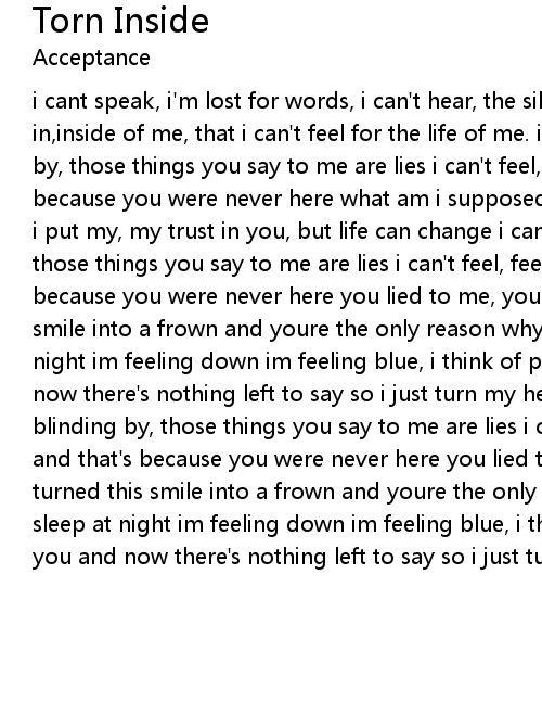 i cant speak, i'm lost for words, i can't hear, the silence burns, a hole in,inside of me, that i can't feel for the life of me. i can' see, i'm blinding by, those things you say to me are lies i can't feel, feel you near, and that's because you were never here what am i supposed to do? how am i supposed to feel? i put my, my trust in you, but life can change i can' see, i'm blinding by, those things you say to me are lies i can't feel, feel you near, and that's because you were never here you lied to me, you let me down, you turned this smile into a frown and youre the only reason why, i find it hard to sleep at night im feeling down im feeling blue, i think of past time spent with you and now there's nothing left to say so i just turn my head away... i can' see, i'm blinding by, those things you say to me are lies i can't feel, feel you near, and that's because you were never here you lied to me, you let me down, you turned this smile into a frown and youre the only reason why, i find it hard to sleep at night im feeling down im feeling blue, i think of past time spent with you and now there's nothing left to say so i just turn my head away... |