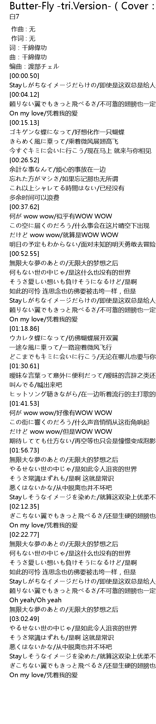 | [01:22.14] | ウカレタ蝶になって/仿佛蝴蝶展开双翼 |