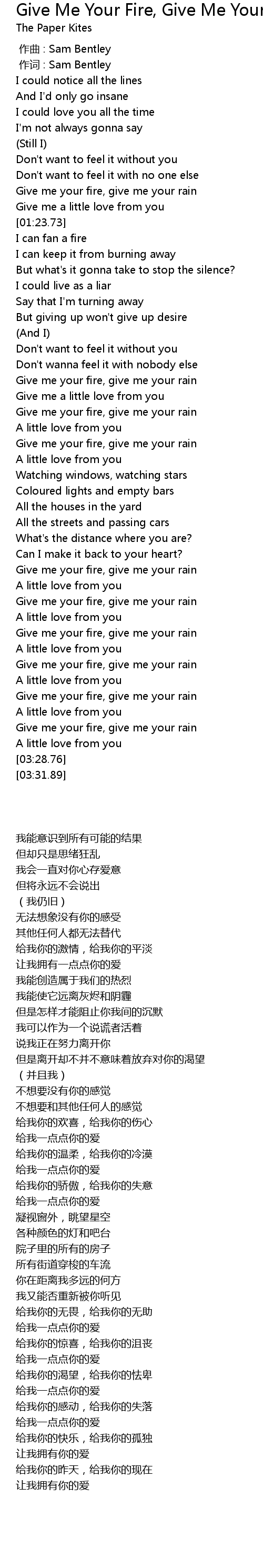 | Song | Give Me Your Fire, Give Me Your Rain |