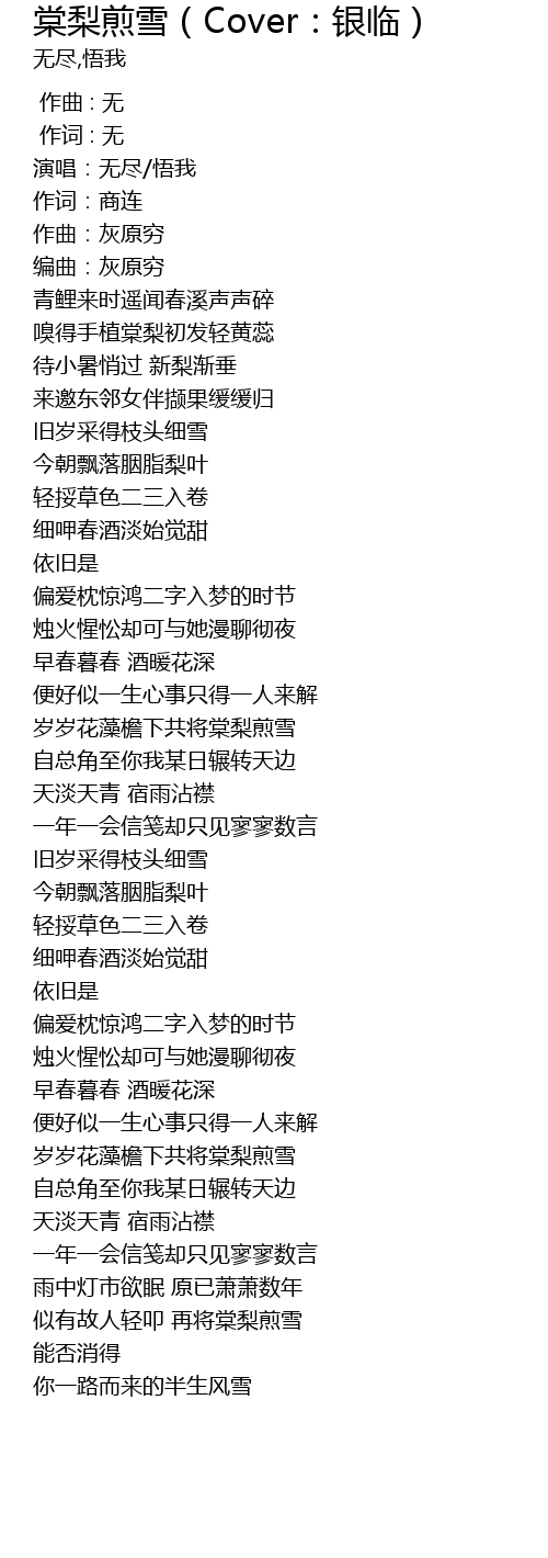 | [03:36.13] | 似有故人轻叩 再将棠梨煎雪 |