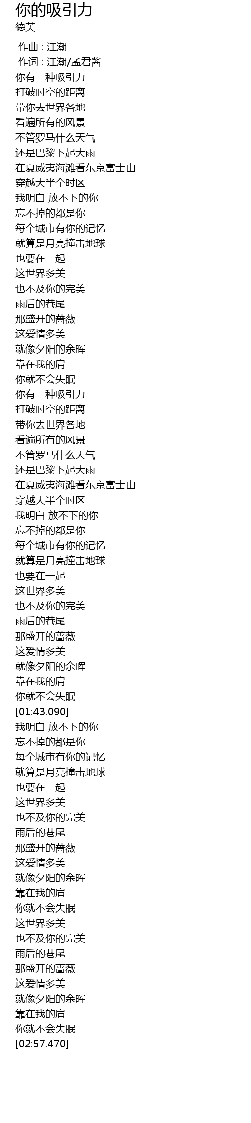 | [00:56.370] | nǐ yǒu yī zhǒng xī yǐn lì |