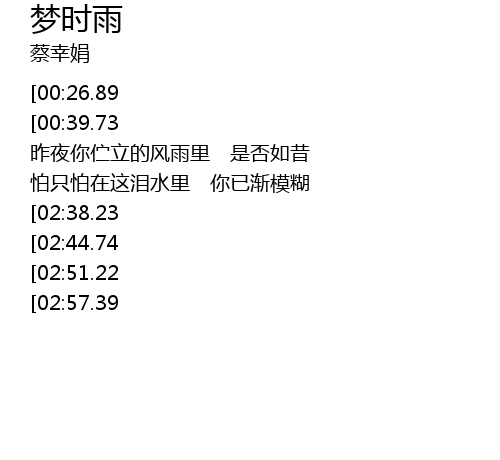 | [03:10.87][02:44.74][01:25.94] | 梦时的雨 如水又如泪 |