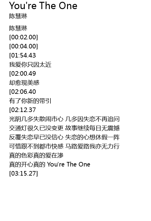 | [03:00.39][02:12.37][01:12.32][00:24.38] | zhao chu xin de bin fen You' re The One |