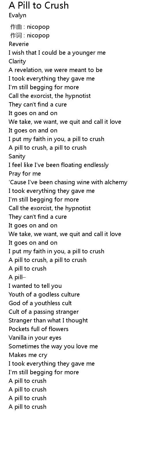| [00:57.699] | I put my faith in you, a pill to crush |