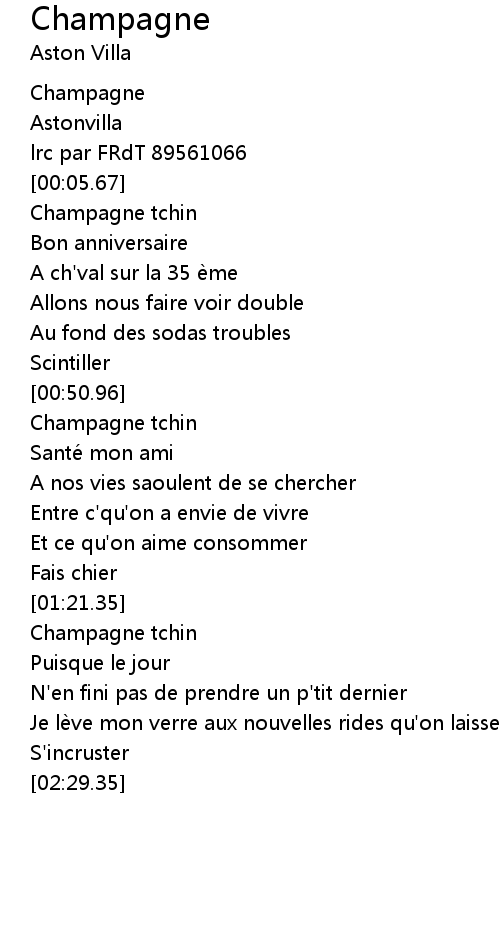 | [01:57.08] | Champagne tchin |