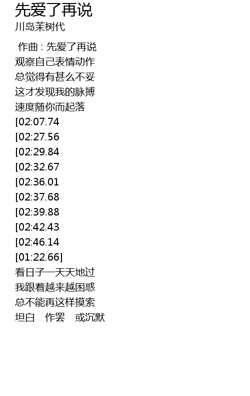 | [02:48.18][02:27.56][01:46.74][01:00.70] | bù rú wǒ xiān ài le zài shuō |