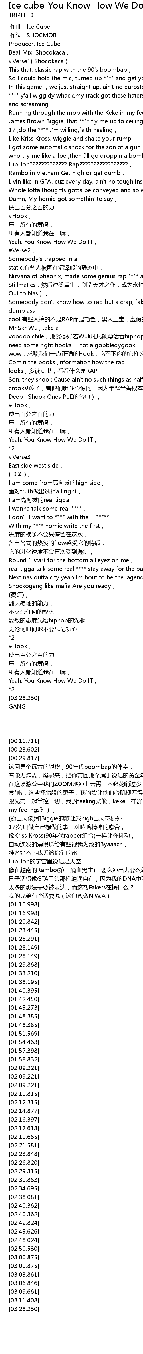 | [01:33.210] | Somebody don' t know how to rap but a crap, fake stories actin' so dumb ass cool. yǒu xiē rén gǎo de bú shì RAP ér shì lēi sè, hēi rén sān bǎo, xū jiǎ de gē cí, sì hū hěn swag, |