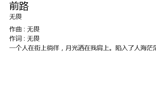 | 一个人在街上徜徉,月光洒在我肩上。陷入了人海茫茫,不见了许久的狂妄。现实总把幻想打伤,刺破了伪装的坚强。其实我们都一样,时常会迷失方向。我的前路在何方,我的命途会怎样,寂静的夜没有答案,我在来去的路上彷徨。我的前路在何方,我的命途会怎样,你我仍然走在老路上,心底是否有个执念叫梦想。心底是否有个执念叫梦想。 |