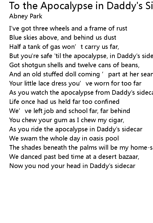 | But you' re safe ' til the apocalypse, in Daddy' s sidecar | |