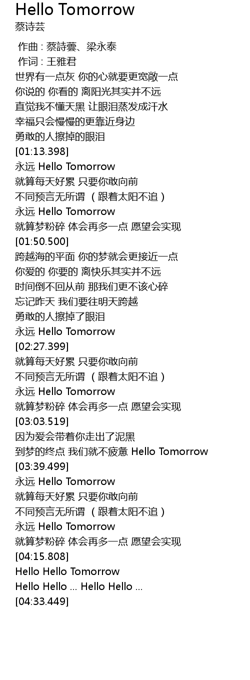 | [03:58.839] | 永远 Hello Tomorrow |