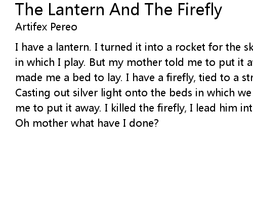 | I have a lantern. I turned it into a rocket for the sky, illuminating the ground in which I play. But my mother told me to put it away, led me to my room and made me a bed to lay. I have a firefly, tied to a string. I led into the sky. Casting out silver light onto the beds in which we slumber. But my mother told me to put it away. I killed the firefly, I lead him into the lantern in the sky. Oh mother what have I done? |