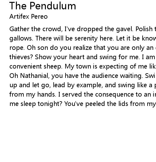 Gather the crowd, I've dropped the gavel. Polish the badges and prepare the gallows. There will be serenity here. Let it be known who led Nathanial to the rope. Oh son do you realize that you are only an example for the cowards and the thieves? Show your heart and swing for me. I am the power and you are the convenient sheep. My town is expecting of me like vultures circling their feast. Oh Nathanial, you have the audience waiting. Swing like a pendulum for me. Give up and let go, lead by example, and swing like a pendulum for me. Wipe the sin from my hands. I served the consequence to an innocent man. Oh son won't you let me sleep tonight? You've peeled the lids from my eyes and desecrated my pride.