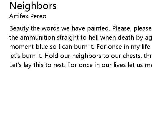 | Beauty the words we have painted. Please, please let us change the world. Damn the ammunition straight to hell when death by age is so unfamiliar. Set this moment blue so I can burn it. For once in my life let me make the difference. So let's burn it. Hold our neighbors to our chests, throw the guns in the fire. Let's lay this to rest. For once in our lives let us make the difference. |