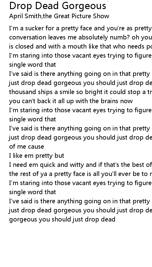 I've said is there anything going on in that pretty little head? cause if you're just drop dead gorgeous you should just drop dead a face that could launch a thousand ships a smile so bright it could stop a train won't do you no good if you can't back it all up with the brains now |
