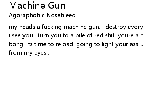 | my heads a fucking machine gun. i destroy everything i put my eyes on. everytime i see you i turn you to a pile of red shit. youre a christian orgasm. pack the bong, its time to reload. going to light your ass up again, till smoke drifts from my eyes... |