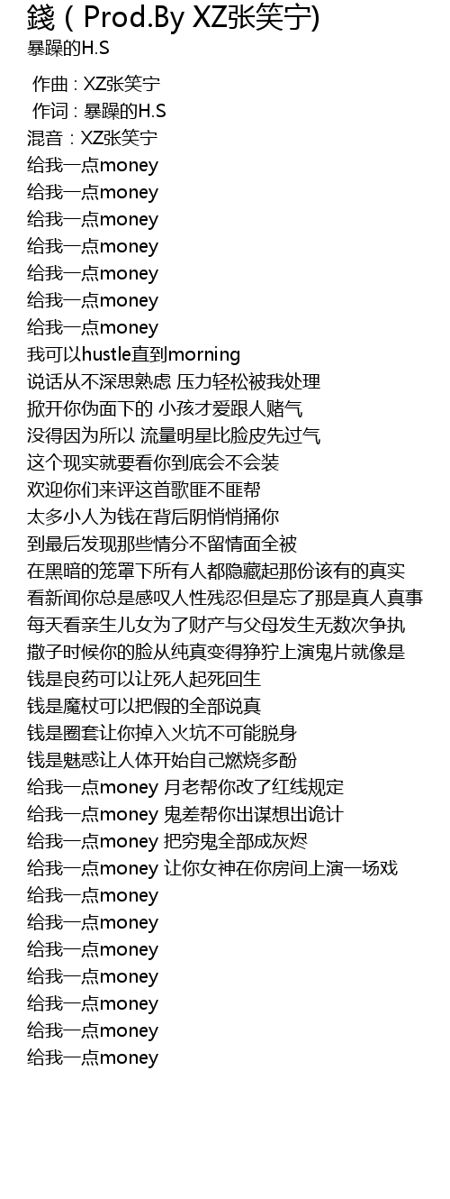 | [01:38.15] | gěi wǒ yì diǎn money |