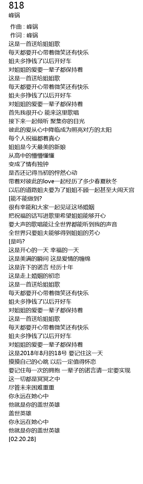 | [00:01.000] | 作词 : 峰锅 |