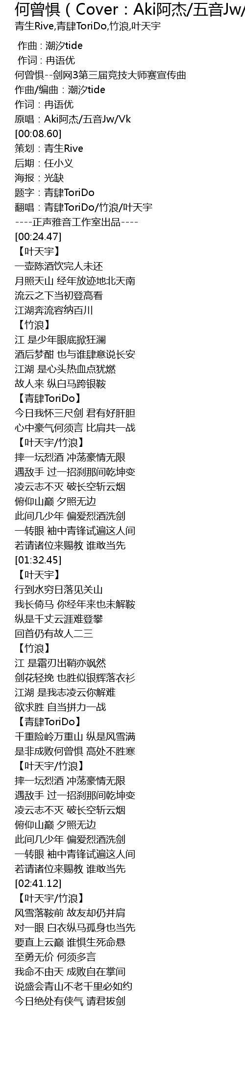 | [00:00.21] | 何曾惧--剑网3第三届竞技大师赛宣传曲 |