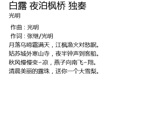 | [01:11.000] | 月落乌啼霜满天,江枫渔火对愁眠。 |