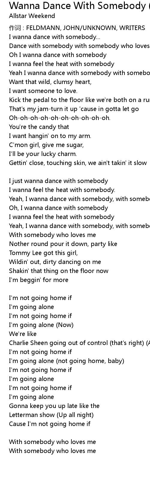 | Yeah I wanna dance with somebody with somebody who loves me | |