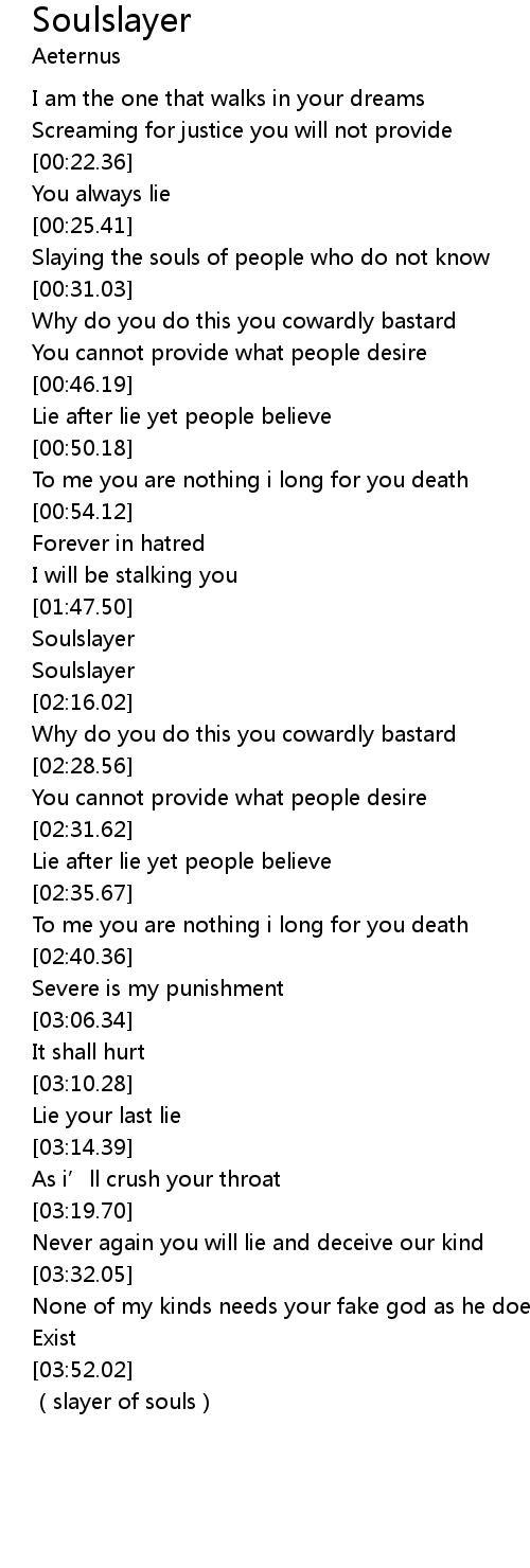 | [03:29.06] | Never again you will lie and deceive our kind |