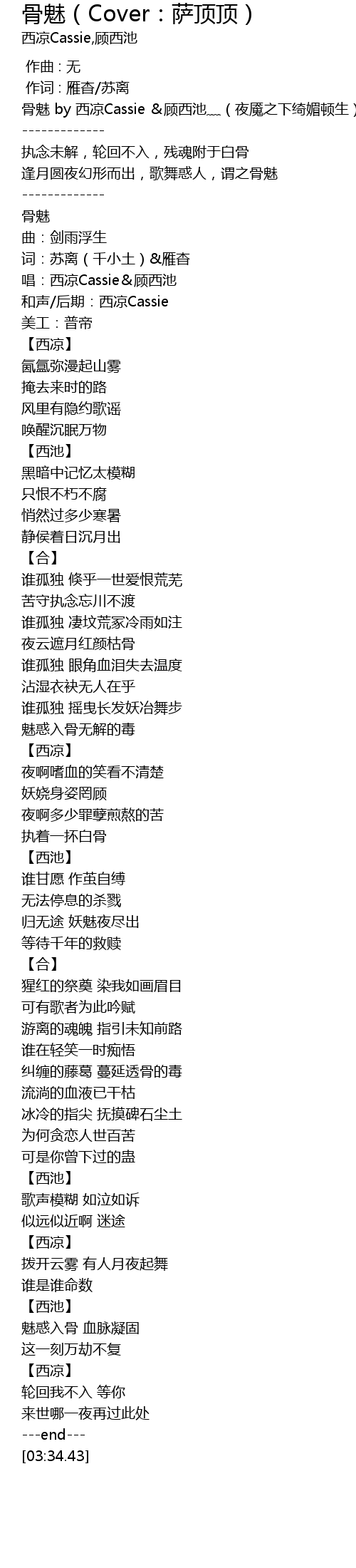 | [00:05.91] | 骨魅 by 西凉Cassie &顾西池﹏(夜魇之下绮媚顿生) |