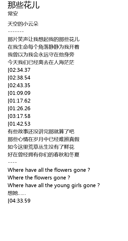| [03:52.01][03:17.58][01:35.00] | 她们已经被风吹走散落在天涯 |