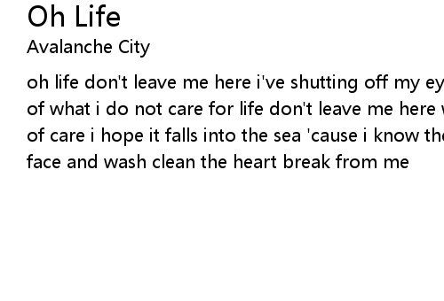 | oh life don't leave me here i've shutting off my eyes 'cause i've had too much of what i do not care for life don't leave me here what can be done with a world of care i hope it falls into the sea 'cause i know the waves will rush over my face and wash clean the heart break from me |