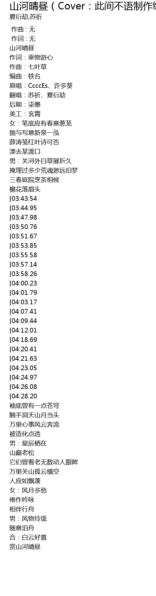 | [02:01.15][04:28.20] | 女:赏山河晴昼 |