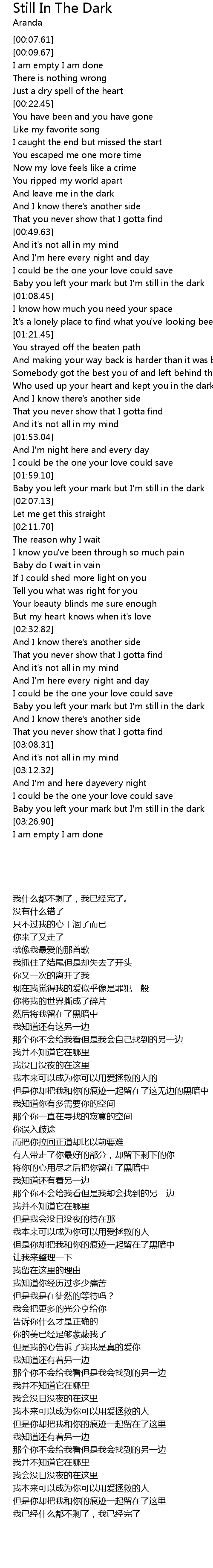 Baby you left your mark but I'm still in the dark |