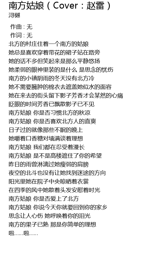 | [00:57.85] | 北方的村庄住着一个南方的姑娘 |