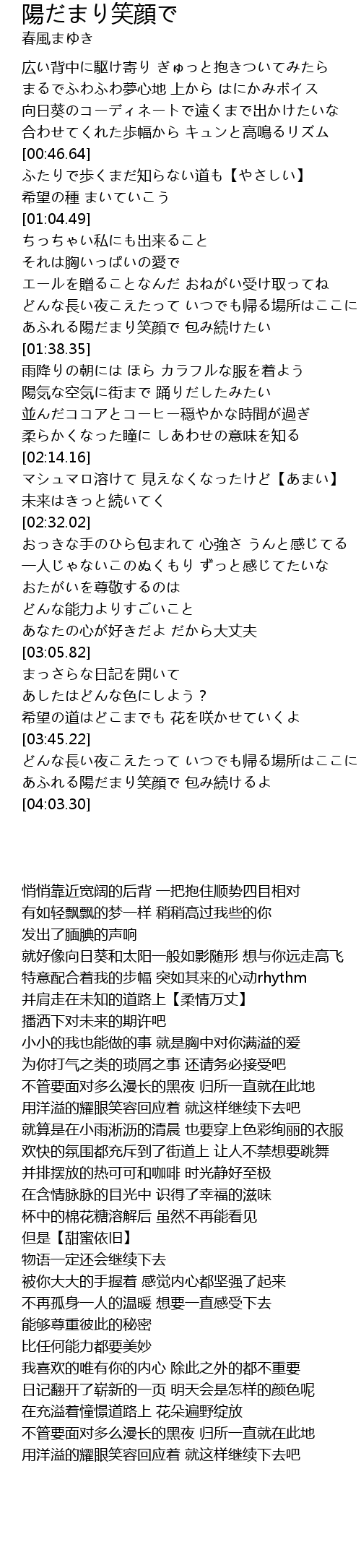 | [03:52.67] | あふれる陽だまり笑顔で 包み続けるよ |