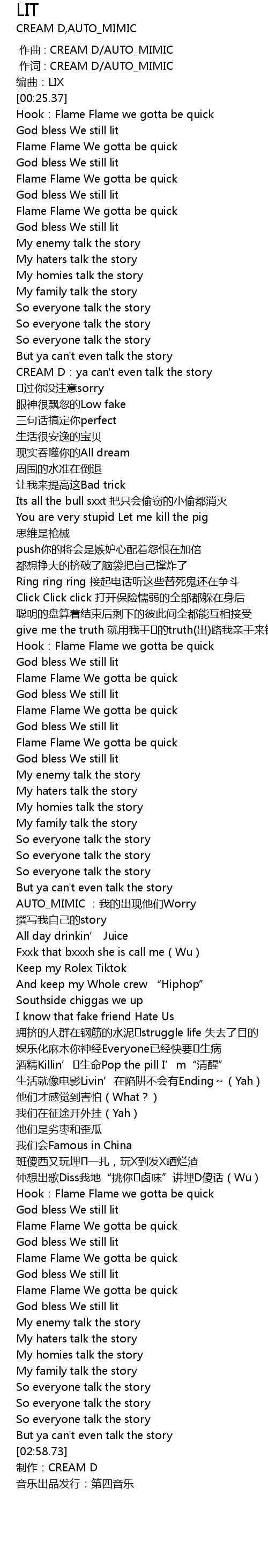 | [00:25.74] | Hook:Flame Flame we gotta be quick |