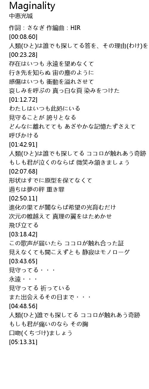 | [04:48.92] | 人類(ひと)誰でも探してる ココロが触れあう奇跡 |