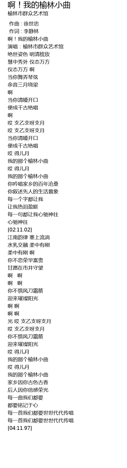| [00:13.27] | 演唱:榆林市群众艺术馆 |