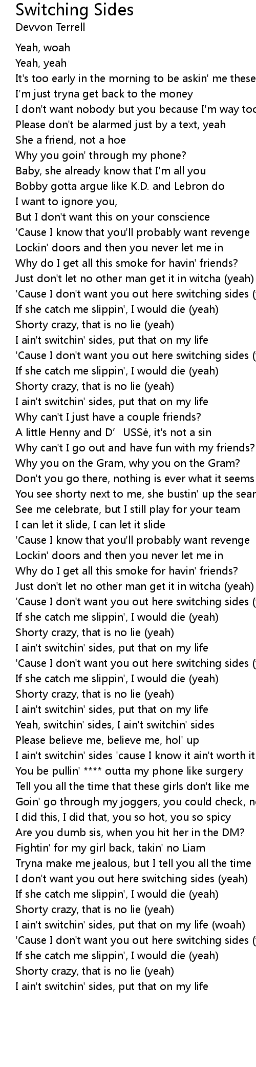 | [02:09.77] | Yeah, switchin' sides, I ain't switchin' sides |