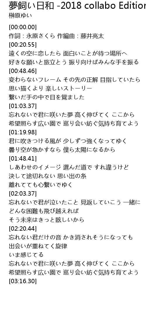 | [00:15.55] | 作詞:永原さくら 作編曲:藤井亮太 |