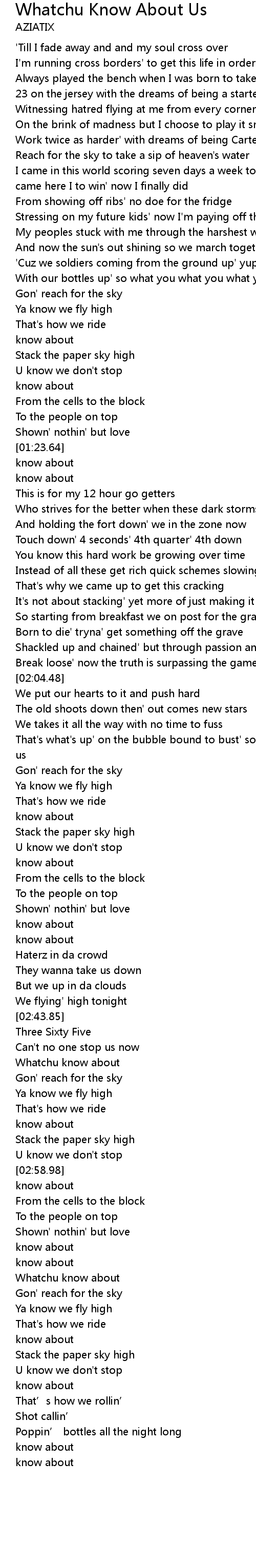| [01:04.42] | With our bottles up' so what you what you what you know about us |