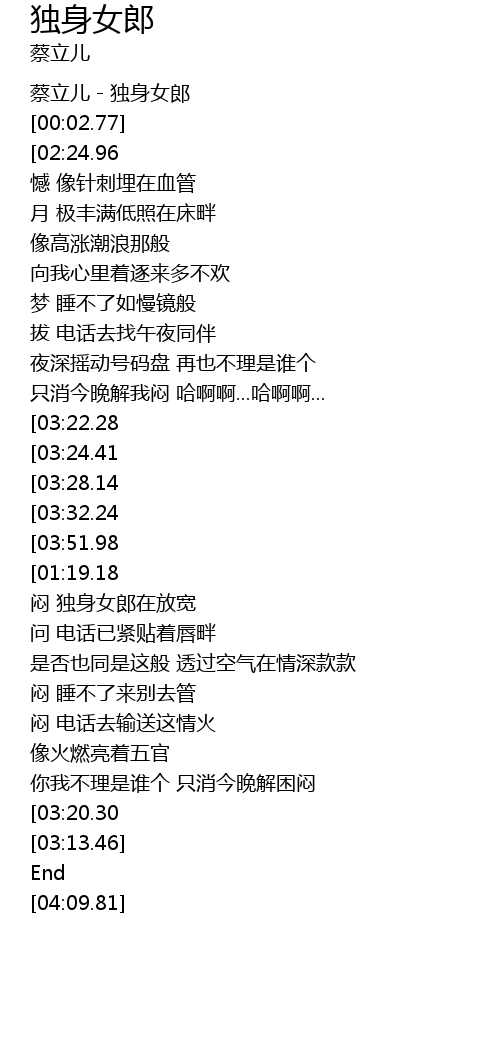 | [00:00.00] | 蔡立儿-独身女郎 |